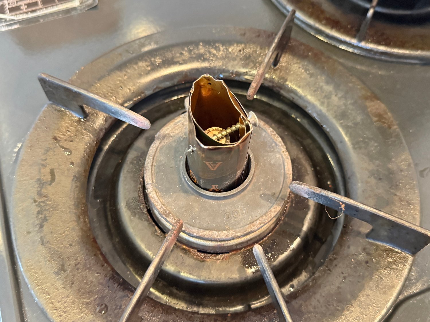 温度センサーが作動して火力が抑えられてしまうため、工夫が必要です。私はアルミ缶を切って筒状にし、木ネジで貫通させたパーツをセンサーに被せることで、センサーの押し込み対応を施しました。これにより不要な火力制御がかからず、快適に使用できます。